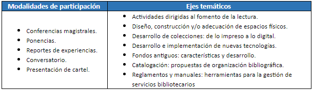 Profesionales adscritos a las Unidades UPN y UP descentralizadas del país que tengan a su cargo y/o sean responsables de las bibliotecas, o bien interesados en el tema de la Organización Documental con prácticas exitosas en sus áreas de adscripción, participen en el Foro BiblioUPN 2020. Bases para integrar el sistema bibliotecario de la Universidad Pedagógica Nacional, que se llevará a cabo los días 9,10 y 11 de diciembre del año en curso, a través de las siguientes modalidades de participación y ejes temáticos: